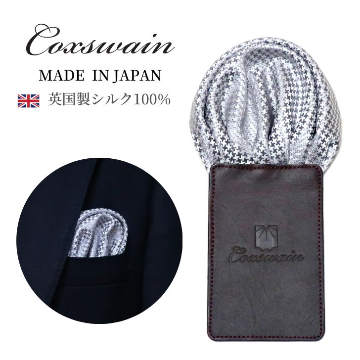 COXSWAIN ポケットチーフ シルバー ホワイト 千鳥格子 英国製シルク ジャガード織り 日本製 胸ポケットに挿すだけ CW-PC059